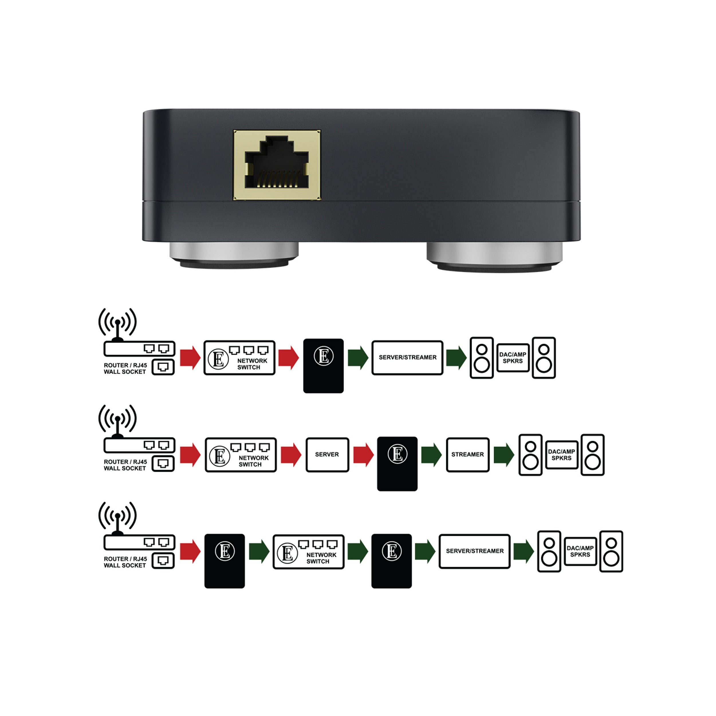 The EE1 Plus is placed in series with your Ethernet cables. One piece between router and switch, or between switch and streamer, already provides a clear improvement. In larger systems, multiple units can be used to clean the entire network path and create an even quieter musical foundation.